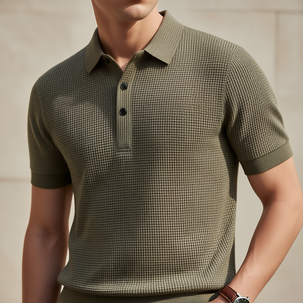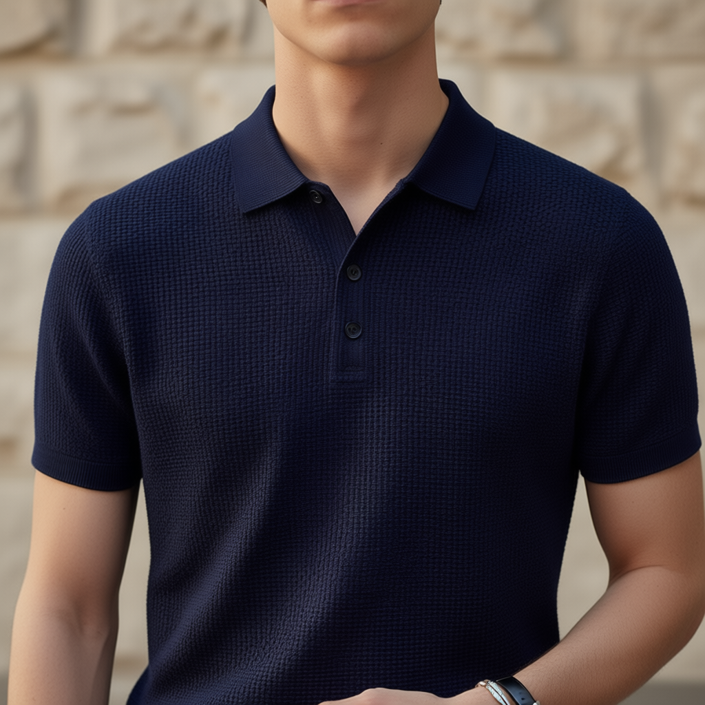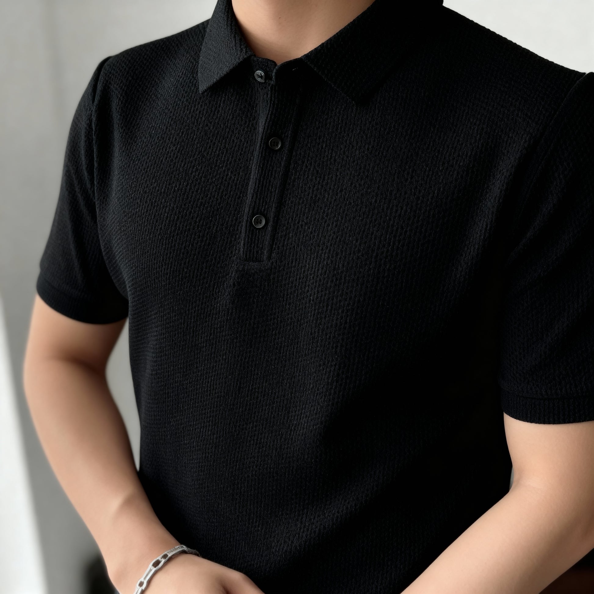 Elegant men's short-sleeve polo shirt made from textured, breathable fabric, perfect for both casual and refined looks